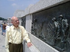 Navy corpsman Joe Brennan is about to go ashore Okinawa in the Pacific theatre during WWII. Beachmaster Virgil Weathers, who died in 2008, is to Joe's left. The black and white photo was first published in Navy Medicine at Normandy D-Day June 6, 1944.At the 2001 U.S. Navy Memorial, Washington, DC premiere of the Navy documentary are, left to right, Historian Jan Herman, Corpsman Vince Kordack, Beachmaster Joseph Vaghi, Dr. Richard Borden, Dr. Joseph Brennan, Dr. Lee Parker and Director Jack Lewin.