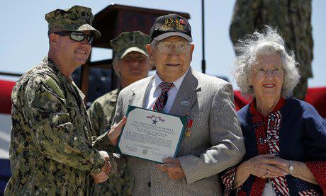 US Navy commander Erik R. Nilsson, left, Beachmaster Unit ONE commanding officer, shakes the hand of Frank H. Walden, a Hospital Apprentice 1st Class who received his Bronze Star for service on Omaha Beach, D-Day, June 6, 1944. Walden and his wife Barbara Walden, right, are from Walnut Creek. Photo by John Gastaldo