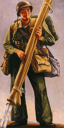 Navy corpsman "Ready for Duty" oil on canvas, 1943, by Irwin Hoffman, Gift of Abbott Laboratories. On the Easy Red sector of Omaha Beach, "The Tough Beach" watercolor by Navy Combat Artist Dwight Shepler, on D-Day 6 June 1944. In the foreground is USS LCI(L) 93, aground, holed, and lost. This USCG vessel received at least "ten direct hits, two passing through the pilot house, two through the starboard bow at the forecastle and the remainder along the port side." Courtesy U.S. Navy Art Collection, Washington, D.C.