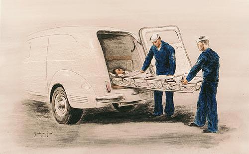 "Handle With Care" pastel by Julian Levi. A wounded serviceman on the Stokes litter is placed in the ambulance for a trip to the Norfolk Naval Hospital, Portsmouth, Virginia. (Gift of Abbott Laboratories) Picture of a Hospital Ward Car, part of a hospital train, on standby for debarking patients, at Hampton Roads, Virginia, 29 May 1943.