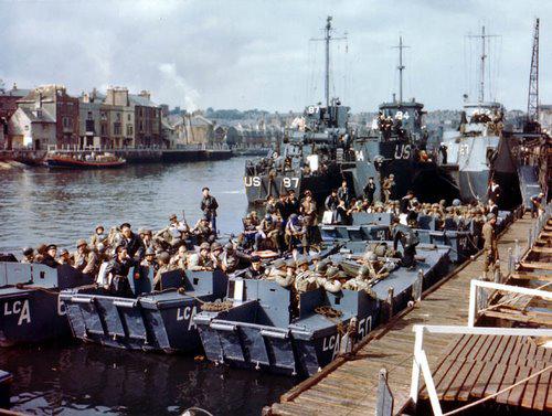 “By the time we approached the city of Weymouth,” said Snyder, “the attitude of the citizen population had drastically changed. The air was electrically charged. Crowds had collected at nearly every intersection. Flags - American, British and even a few French tricolors were seen in windows. Some children along the curbs were waving small hand-held flags. As Weymouth harbor itself came into view, the cause of all the excitement became obvious. Arrayed before our eyes was the most colossal fleet than even that historic seaport had ever witnessed. Ships, boats and barges of every type and description filled the harbor as far as the eye could see. The Weymouth townspeople, enduring five years of war, had seen many embarkations of ships and men, but obviously never of the size and scope of the panorama they viewed on this day.“