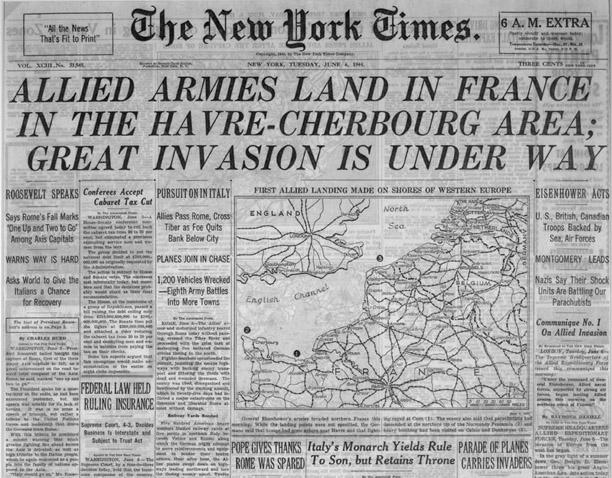 Early in the morning on D-Day, the usual crowd of several hundred gathered outside St. Patrick’s Cathedral on Manhattan’s Fifth Avenue for the first regular Mass. In New York’s Times Square, many Americans first learned from electronic bulletins that D-Day had begun. Over CBS radio, General Eisenhower announced, “The tide has turned…We will accept nothing less than full victory.” Although it had not been rung for over 100 years, the fragile Liberty Bell in Philadelphia began ringing, broadcast throughout the nation over NBC radio. President Roosevelt wrote a D-Day prayer he would deliver on the radio. By nightfall, 75,000 grateful New Yorkers had worshiped at St. Patrick’s Cathedral. The Statue of Liberty, darkened since the war’s early days, was ablaze again – a full 96,000 watts.