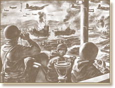 Dr. Kincaid was killed during a kamikaze attack off Okinawa. [invasion art by Ken Riley]